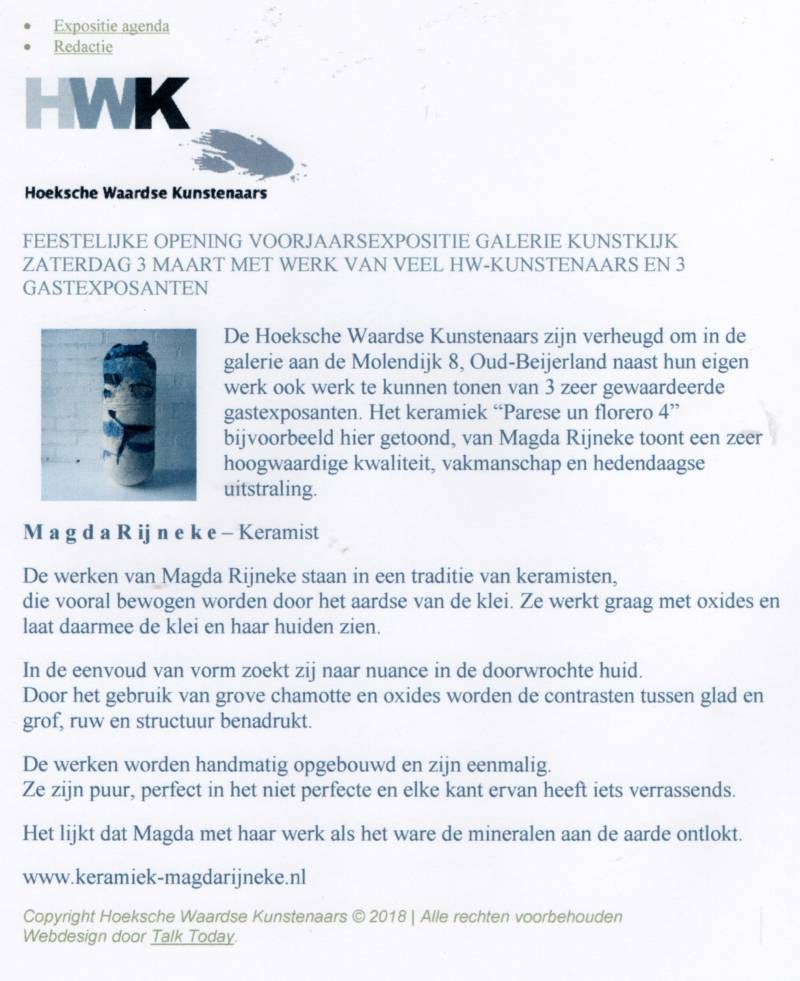 Magda Rijneke is bekend door haar robuuste maar toch verfijnde handvormen. Haar werk in strakke vormen en eenvoud gekoppeld met een extra accent van oxides verdiepen haar werkstukken opvallend.
