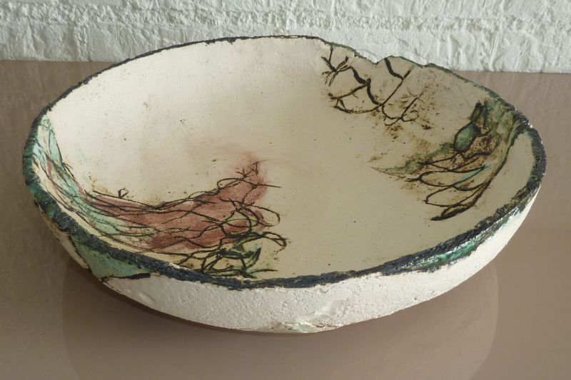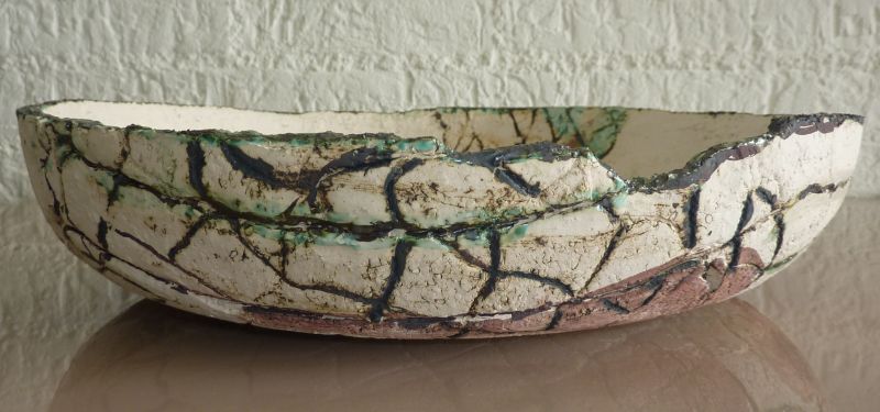 Schaal bewerkt met ijzer/koperoxides /34cm >>>