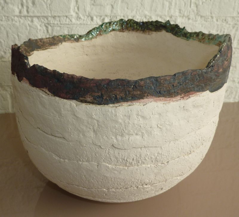 Pot bewerkt met koper/ijzeroxides, doorsnee 23cm